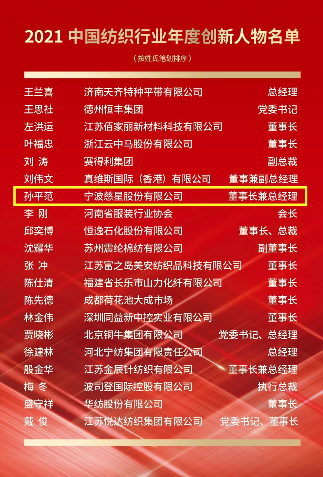 為推動(dòng)行業(yè)不斷創(chuàng )新,實(shí)現高質(zhì)量發(fā)展,6月27日下午,中國紡織工業(yè)聯(lián)合會(huì )第五次會(huì )員代表大會(huì )暨五屆一次理事會(huì )五屆一次常務(wù)理事會(huì )召開(kāi)。會(huì )上,中國紡織工業(yè)聯(lián)合會(huì )副會(huì )長(cháng)孫淮濱宣讀了“2021中國紡織行業(yè)年度創(chuàng )新人物”名單,授予寧波慈星股份有限公司董事長(cháng)兼總經(jīng)理孫平范等20位同志“2021中國紡織行業(yè)年度創(chuàng )新人物”榮譽(yù)稱(chēng)號,這是孫平范董事長(cháng)第二次獲此殊榮。